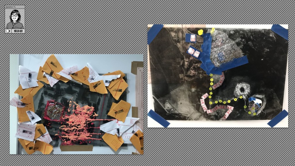 我想分享第二個案例是不義遺址踏查的地圖工作坊。我們當時帶孩子走訪台北市的不義遺址,包含國家人權博物館、馬場町、六張犁墓園。他們過程中產生好奇,因為是他們在學校中、課本上很少著墨或學習的。但在走訪後,我們邀請藝術家帶領他們用創作去將感受做轉化。有些同學會用藝術家準備的物件、顏料去塗抹,透過創作橋接在踏查的情感、感受,用手去表現並產出自己的地圖,並用一定的表現手法呈現當時的人在當時的移動。