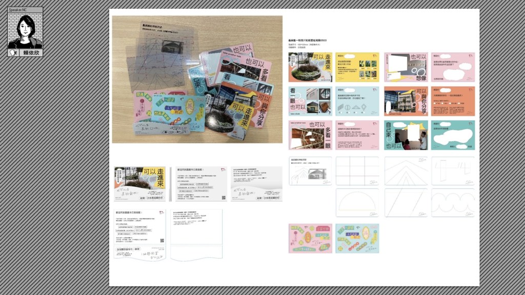 在這裡面的創造性就很有趣。我們和害喜以及藝術家合作開發一份工具包,讓他們可以跨越語言的障礙,進入到身體觀看作品、跟作品互動這樣的經驗中。我們在幾場工作坊中得到很多的回饋,也開始理解到他們認為怎麼進入美術館比較有趣,而創造性針對不同群眾可以琢磨在什麼樣的地方,引導出不同的觀看方式。