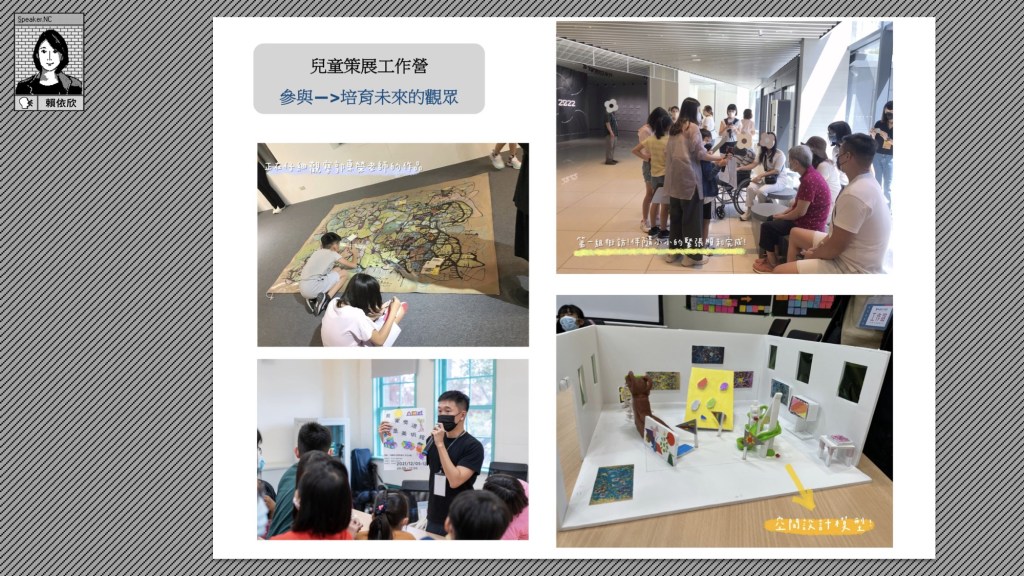 賴依欣館長:進入這一個階段的分享,我想跟大家討論的是機構怎麼樣去設定對話的對象,我們透過什麼樣的方法與可能性,透過什麼樣的媒介去鋪陳、開展、擾動出不同的可能性。剛剛說整個開館前後我們長出很多不同的內容與方式,比如繪本、戲劇、導覽等各種類型,讓民眾對於藝術領域有各種想像空間。我們也把藝術創造形式帶入校園,用影像創作等方式進行互動。