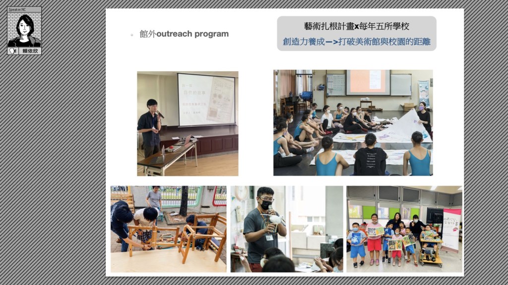館外部分,我們很希望可以主動跨越博物館空間,所以在跟藝術家的計畫中,美術館已經做了三年,我們每年都會有五所不同的學校,有長達三個月的課程。我們期待透過藝術家與老師的共備課程,從藝術家本身所關注的脈絡展開,和老師討論適合不同年齡層與對象的學生族群及其教學方式,跨越既有的美術課程,了解文本、影像、聲音等創作形式。他們也會來參觀美術館,但歷經數週的創作過程後,又會回到美術館來展出。
