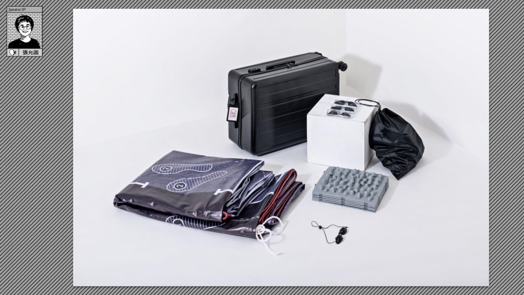 藝術家張允菡:接下來會分享我自己在害喜時期,陪伴藝術家工作的角色,但等一下的分享也還是會在於作為藝術家我對於我做的這些事情有什麼樣的看法。這個是害喜和國家人權博物館的白色恐怖不義遺址空間教具箱,來簡單說明這過程是在怎麼和藝術家及老師創造出教具的合作經驗。這教具是用來在教學現場協助同學們更加理解白色恐怖的不義遺址的內涵。這個行李箱中的教具有包含眼罩、走了會痛的健康步道等等這些道具,而這個教具箱本身是一個協作的成果。