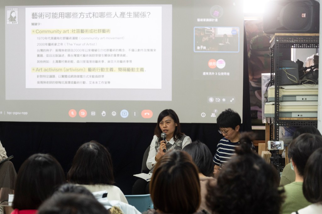 台灣的部分則是藝術家吳瑪俐老師則是從2000年以來積極引入社群藝術的概念,不僅以創作及策展來實踐,也出版論述,是台灣當代藝術與群眾發生關係的重要典範。吳瑪俐老師很認同英國 Community Art center的中心,這樣的中心讓藝術不是高高在上,而是讓民眾可以用不同方式創作。她也因此透過創作和策展在台灣實踐這樣的內涵,例如旗津灶咖,可以在當地看到許多不同活動,很重視創作過程,而非只有作品的完成。在台灣還有不同的類型,例如台南土溝農村美術館、大地藝術季,麻豆大地藝術祭現在都還可以看到,還沒有完全撤完。花蓮的森川里海藝術季和部落連結,也很推薦。