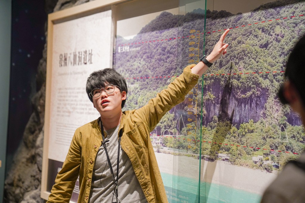 首先,史前史廳的策展人姚書宇說明之所以將該廳選在地下一樓,本身及隱含著所有的文物都是從地底挖掘而出,因此參觀者可以在此處看見化石、遺址,乃至於工具、裝飾、墳墓等文物,想像三萬年前人們在台灣島嶼生存的樣貌。