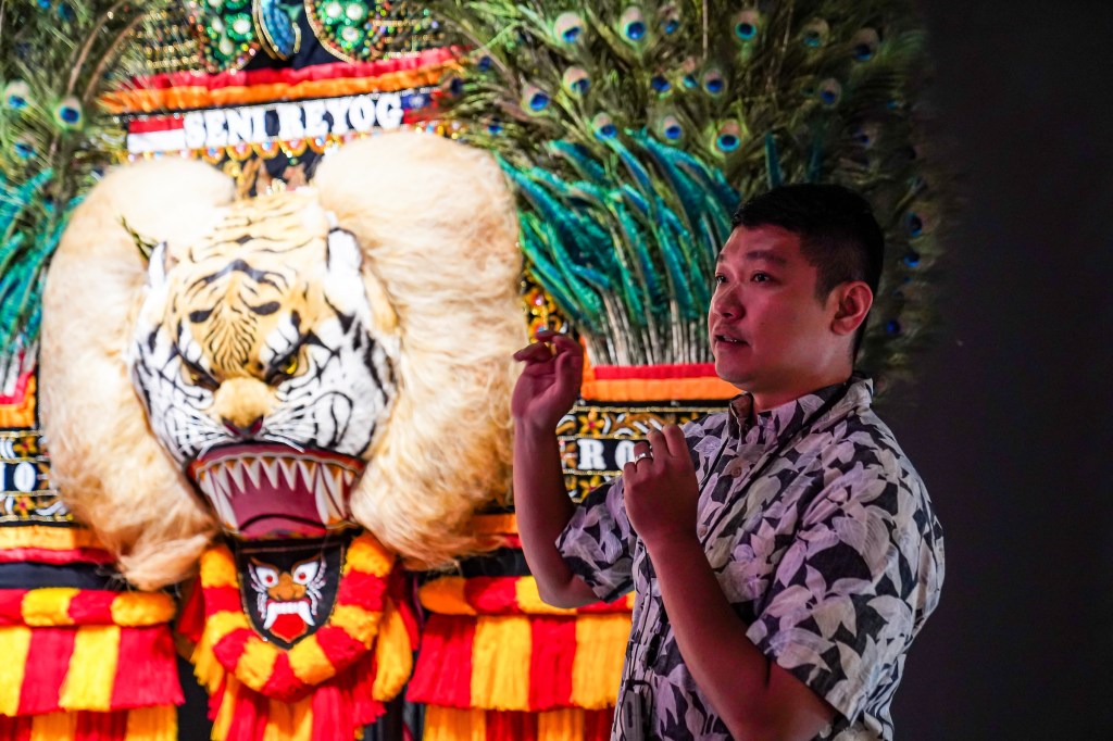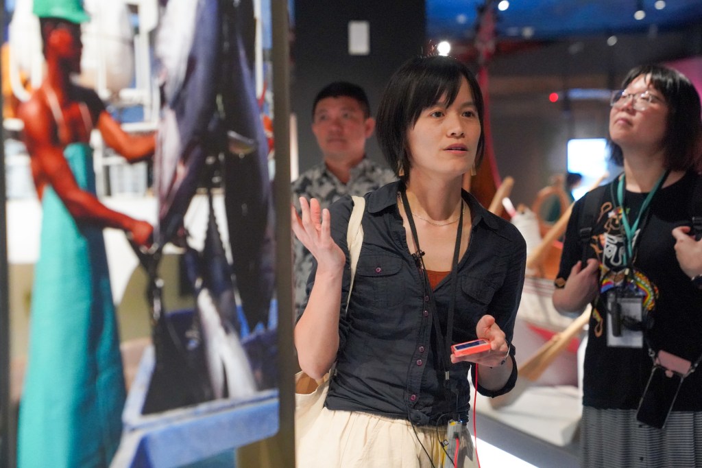 對比史前史廳深入地底的意象,位於史前館二樓的南島廳,則如同緩緩上升的島嶼,展示南島世界多彩樣貌。策展人之一的黃郁倫分享整個南島廳的策展突破過去常見以個別族群的分類方式,改以普世的議題為展示主軸,呈現南島族群的世界觀與海洋文化,以及與不同文化互動的歷史經驗。在南島廳的最後,策展人林芳誠則替藝術家們導覽說明台灣島上原住民族經歷過的殖民與抗爭,並透過來自部落的物件、藝術作品反應原住民族在外來政權的侵略下所發展出的思想與鬥爭。