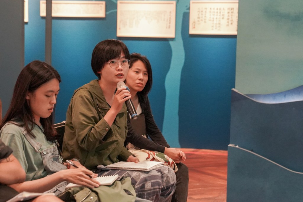 經歷一個下午的導覽,最後藝術家們、博物館館長及策展夥伴一同在探索館進行交流。黃郁倫開場先說明史前館成立過程,源自於史前卑南遺址的出土,使得博物館思考史前文化之與當今台灣的連結。